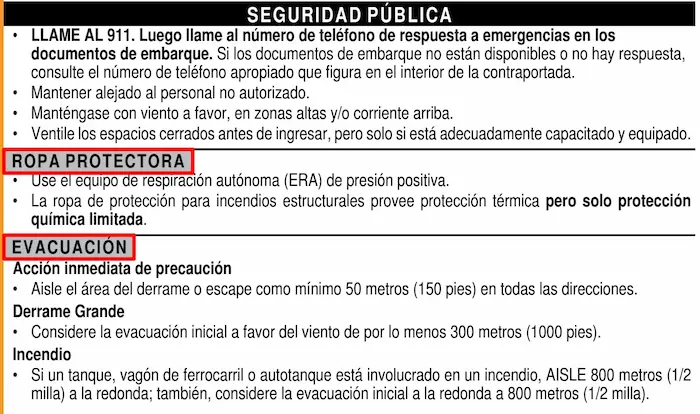 En esta sección se mencionan todas las recomendaciones de seguridad. Este compuesto por 62 “Guías de Emergencia”. Cada guía recomienda procedimientos de seguridad y de respuesta a emergencia para proteger al personal de respuesta y al público. Cada Guía está diseñada para cubrir un grupo de materiales que poseen características químicas y toxicológicas similares.
