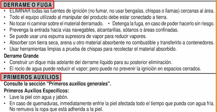 • Derrame o fuga: Incluye recomendaciones generales, y puede describir el procedimiento de respuesta para derrame pequeño y derrame grande.