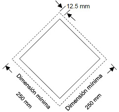 • Forma y tamaño: Rombo de 250 x 250 mm como mínimo, por lado, debiendo llevar una línea del mismo del color del símbolo trazada a 12.5 mm del borde exterior.